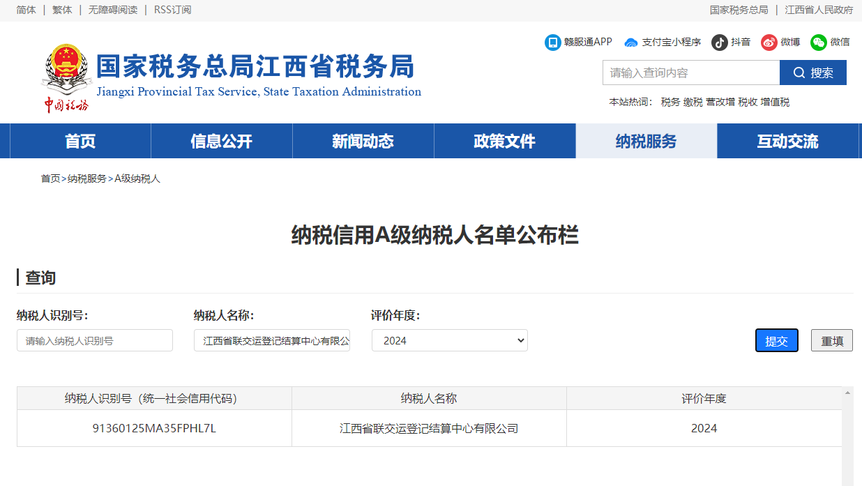 近期,國(guó)家稅務(wù)總局江西省稅務(wù)局公布了2024年度納稅信用A級(jí)納稅人名單,公司連續(xù)4年獲評(píng)“納稅信用A級(jí)納稅人”稱(chēng)號(hào)。