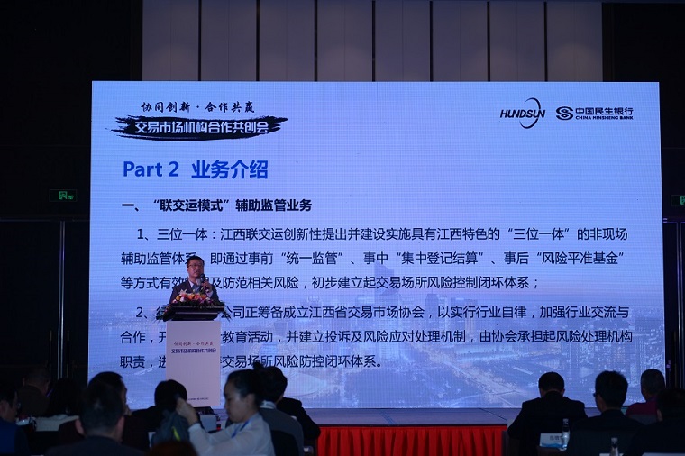 江西聯(lián)交運(yùn)總經(jīng)理劉祖國在會(huì)議中對(duì)公司整體建設(shè)運(yùn)營經(jīng)驗(yàn)及未來發(fā)展設(shè)想等方面進(jìn)行了全面闡述,表示江西聯(lián)交運(yùn)作為江西省交易場所統(tǒng)一監(jiān)管和集中登記結(jié)算平臺(tái)的唯一運(yùn)營機(jī)構(gòu),公司正努力構(gòu)建及實(shí)現(xiàn)以交易場所集中登記結(jié)算為核心的“三位一體+行業(yè)協(xié)會(huì)”等非現(xiàn)場輔助監(jiān)管體系,進(jìn)一步落實(shí)完善監(jiān)管閉環(huán)體系建設(shè),打造輔助監(jiān)管的“江西模式”,幫助政府進(jìn)一步完善交易場所風(fēng)險(xiǎn)控制管理手段,從而實(shí)現(xiàn)區(qū)域內(nèi)交易場所健康規(guī)范發(fā)展。公司亦將在深耕交易市場發(fā)展的基礎(chǔ)上,重點(diǎn)推動(dòng)具有江西特色產(chǎn)業(yè)及品種交易場所的開發(fā)建設(shè),并堅(jiān)持“立足江西、面向全國”的發(fā)展戰(zhàn)略,力求把公司打造成一個(gè)寬泛的金融監(jiān)管與服務(wù)的綜合性運(yùn)營平臺(tái)。