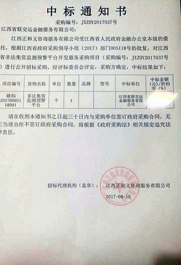 2017年8月9日,江西省聯(lián)交運(yùn)金融服務(wù)有限公司(以下簡稱“公司”)成功中標(biāo)江西省非法集資監(jiān)測預(yù)警平臺(tái)開發(fā)服務(wù)項(xiàng)目,這標(biāo)志著公司在向江西省地方金融統(tǒng)一監(jiān)管云平臺(tái)的建設(shè)目標(biāo)上又邁出了堅(jiān)實(shí)一步。