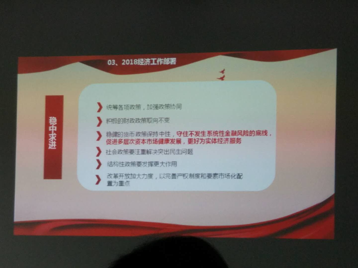 本次會(huì)議認(rèn)真深入學(xué)習(xí)了中央經(jīng)濟(jì)工作會(huì)議精神,就中央經(jīng)濟(jì)工作回憶中提出的堅(jiān)持“穩(wěn)中求進(jìn)”工作總基調(diào),服務(wù)于供給側(cè)結(jié)構(gòu)性改革這條主線,要全面把握以新發(fā)展理念為主要內(nèi)容的習(xí)近平新時(shí)代中國特色社會(huì)主義經(jīng)濟(jì)思想內(nèi)涵,了解我國經(jīng)濟(jì)基本特征由高速增長階段轉(zhuǎn)向高質(zhì)量發(fā)展階段的變化等內(nèi)容進(jìn)行了認(rèn)真學(xué)習(xí)。