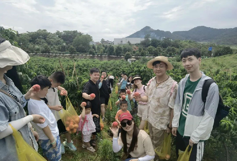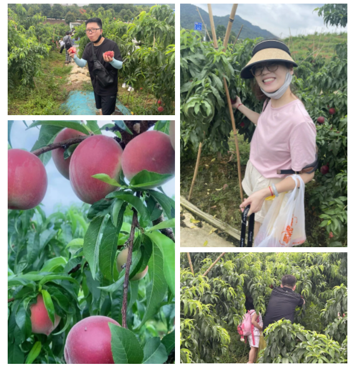 紅桃掛滿枝,笑迎八方客。上午九時許,大家統(tǒng)一出發(fā)來到廬山西海生態(tài)農(nóng)莊,前往果園采摘新鮮可口的大水蜜桃,碩大飽滿、絳紅欲滴的水蜜桃掛滿枝頭,伴隨著徐徐清風(fēng),濃郁的果香飄滿山間。