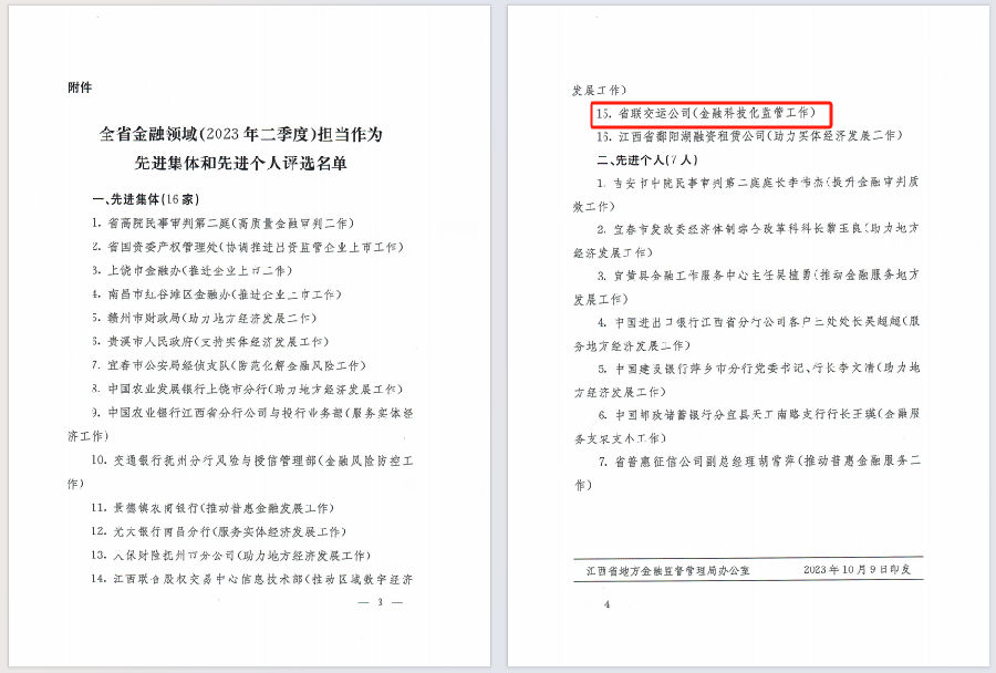 10月9日,省金融監(jiān)督管理局印發(fā)《關(guān)于對全省金融領(lǐng)域(2023年二季度)擔(dān)當(dāng)作為先進集體和個人通報表揚的通知》,省聯(lián)交運公司(金融科技化監(jiān)管工作)獲評全省金融領(lǐng)域(2023年二季度)擔(dān)當(dāng)作為先進集體。