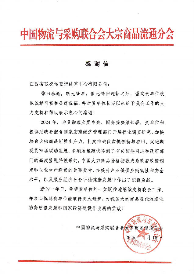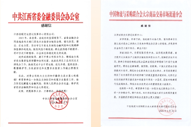 新春前夕,江西聯(lián)交運先后收到來自中國物流與采購聯(lián)合會大宗商品交易市場流通分會和中共江西省委金融委員會辦公室發(fā)來的感謝信,分別對公司長期以來服務(wù)并推動大宗行業(yè)高質(zhì)量發(fā)展及擔(dān)當(dāng)作為、精準(zhǔn)助力為我省防范和處置非法集資工作做出的積極貢獻表示表達充分肯定和感謝。