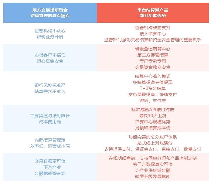 平臺結(jié)算通目前已成功對接服務(wù)多家地方交易場所、醫(yī)藥購銷平臺、網(wǎng)絡(luò)貨運平臺及產(chǎn)業(yè)電商平臺等,有效幫助解決相關(guān)交易平臺資金結(jié)算管理等難點痛點問題。以地方交易場所行業(yè)為例:受監(jiān)管政策趨嚴并行業(yè)發(fā)展良莠不齊等多重因素影響,近年來地方交易場所行業(yè)一直處于規(guī)范調(diào)整中,如何讓監(jiān)管部門提振行業(yè)發(fā)展信心、讓客戶放心安心交易成為各類交易平臺的痛點難點問題。公司推出的平臺結(jié)算通產(chǎn)品在多方面解決了以下諸多問題,在助力地方交易場所行業(yè)轉(zhuǎn)型升級健康發(fā)展等方面發(fā)揮了重要作用。
