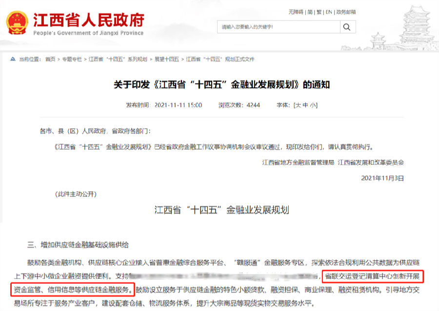 2021年11月3日,《江西省“十四五”金融業(yè)發(fā)展規(guī)劃》印發(fā),指出要牢牢把握服務(wù)實體經(jīng)濟、防控金融風(fēng)險、深化金融改革三大任務(wù),大力發(fā)展科技金融、供應(yīng)鏈金融,支持江西省聯(lián)交運登記結(jié)算中心創(chuàng)新開展資金監(jiān)管、信用信息等供應(yīng)鏈金融服務(wù)。公司迅速響應(yīng)落實《規(guī)劃》指導(dǎo)要求,積極發(fā)揮地方金融基礎(chǔ)設(shè)施作用,創(chuàng)新發(fā)展集中登記結(jié)算管理的服務(wù)內(nèi)容和場景應(yīng)用,推出了資金Ta管家產(chǎn)品。