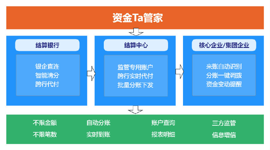 資金Ta管家產(chǎn)品是公司基于省級登記結(jié)算中心職能和優(yōu)勢,在結(jié)算銀行開設(shè)資金結(jié)算管理專戶,為各類具有集中批量資金結(jié)算管理需求的供應(yīng)鏈核心企業(yè)、集團企業(yè)等提供監(jiān)管專用賬戶、跨行實時代付、批量分賬下發(fā)等全流程資金結(jié)算管理服務(wù)。