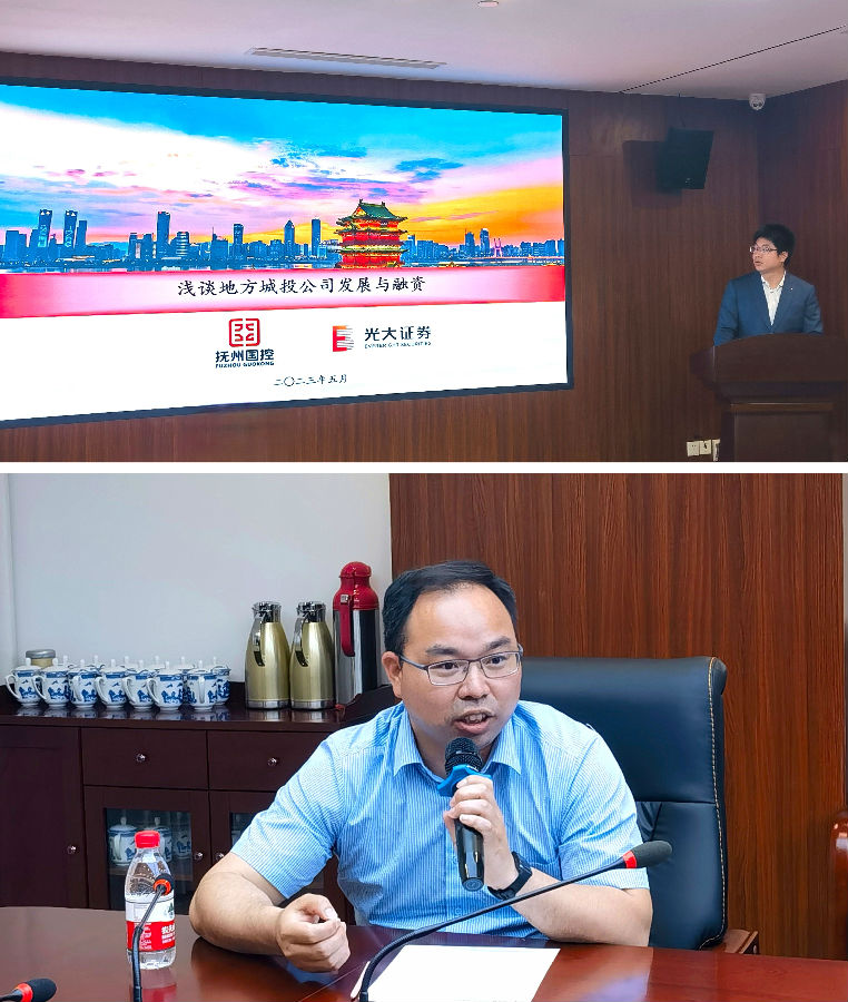 吳覺凡以《淺談地方城投公司發(fā)展與融資》為題,對城投公司功能定位、市場規(guī)模、債券融資流程及管理等方面內(nèi)容進(jìn)行詳細(xì)介紹;并結(jié)合當(dāng)前最新政策、詳實的案例數(shù)據(jù),對城投公司融資發(fā)展現(xiàn)狀及風(fēng)險問題進(jìn)行深入分析,對城投公司未來發(fā)展方向提出了自己的見解和展望。之后,何志遠(yuǎn)結(jié)合撫州國控集團(tuán)相關(guān)城投項目管理和實踐工作,對城投公司在地方發(fā)展中承擔(dān)的重要角色和發(fā)揮出的重要作用進(jìn)行了闡釋,同時簡要介紹了撫州國控集團(tuán)當(dāng)前多元轉(zhuǎn)型升級發(fā)展情況。