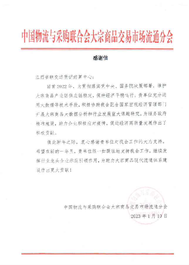 新春前夕,江西聯(lián)交運(yùn)先后收到來自中國物流與采購聯(lián)合會大宗商品交易市場流通分會和中共江西省委金融委員會辦公室發(fā)來的感謝信,分別對公司長期以來服務(wù)并推動大宗行業(yè)高質(zhì)量發(fā)展及擔(dān)當(dāng)作為、精準(zhǔn)助力為我省防范和處置非法集資工作做出的積極貢獻(xiàn)表示表達(dá)充分肯定和感謝。