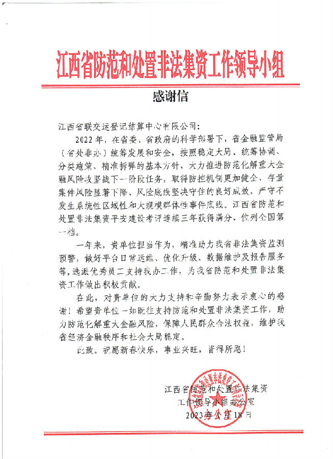 新春佳節(jié)來臨之際,江西聯(lián)交運(yùn)連續(xù)收獲兩封來自江西省防范和處置非法集資工作領(lǐng)導(dǎo)小組辦公室和中國物流與采購聯(lián)合會大宗商品交易市場流通分會的《感謝信》,分別對公司長期以來助力我省防范和處置非法集資工作,保障地方金融穩(wěn)定以及協(xié)助維護(hù)大宗商品產(chǎn)業(yè)鏈供應(yīng)鏈穩(wěn)定,促進(jìn)實(shí)體經(jīng)濟(jì)高質(zhì)量發(fā)展等方面作出的積極貢獻(xiàn)表達(dá)肯定和真誠感謝。